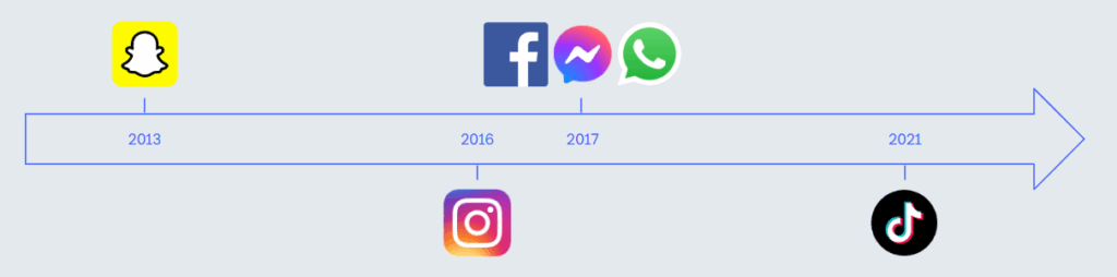 En 2013, Snapchat révolutionne la manière de communiquer sur les réseaux sociaux en lançant les stories, des messages à durée de vie limitée, qui s’effacent au bout de 24 heures.