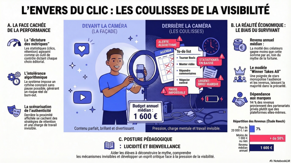 On imagine souvent la création de contenu comme une activité libre et créative. Et elle l’est, parfois. Mais pour ceux et celles qui cherchent à rester visibles, la réalité est plus complexe : les plateformes fournissent des métriques détaillées qui orientent chaque décision éditoriale, du titre à la fréquence de publication, sans jamais révéler exactement comment fonctionne leur algorithme. Cette tension entre créativité et performance est au cœur de l’expérience de nombreux créateur·ices. La comprendre, c’est éclairer les conditions réelles dans lesquelles se produit une grande partie des contenus que les élèves consomment.
